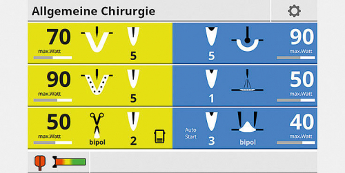 Med den velkendte vandrette placering af både monopolarstikket og bipolarstikket, samt den kontinuerlige visning af alle relevante parametre på skærmen, er brugeren altid opmærksom på de særlige forudindstillinger. Enhver af de indstillinger, du ændrer, kan nemt gemmes i de brugerspecifikke programmer og derefter opkaldes igen, når de er påkrævet. Der er op til 50 hukommelsesspor til rådighed.