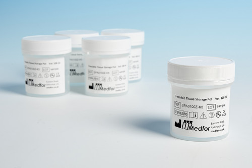 | S400-K | Hvid plastik beholder med hvidt plombebart skruelåg (300/500 ml) | Æske m. 10 stk. | Knogle - Femur hoved |