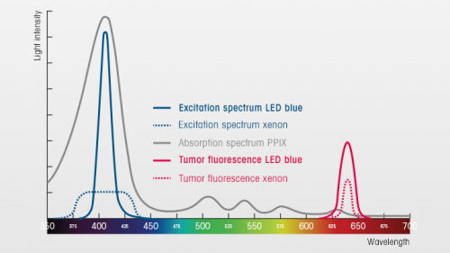 - Emissionsspektret er indstillet optimalt til absorptionsbåndet af fotosensibilisatoren, der anvendes til PDD. Dette resulterer i en meget stærkere tumorfluorescens, end hvad der typisk opnås med xenon lyskilder. Dette muliggør en meget mere kontrastrig visualisering og en resulterer i meget bedre skelnen mellem ondartet og sundt væv. Det bevirker også en meget lysere, og mere naturligt billede.